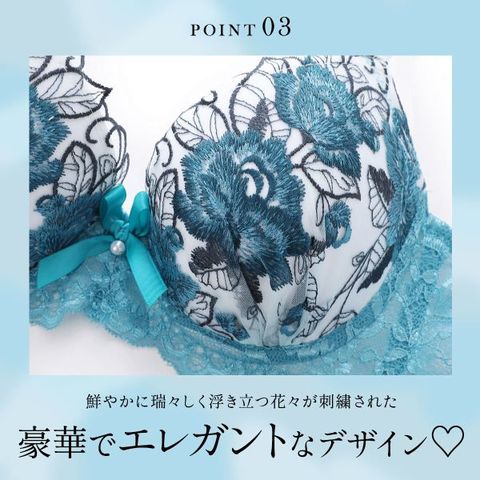 鮮やかに瑞々しく浮き立つ花々が刺繍された豪華でエレガントなデザイン。胸中心にはサテンリボンとパールビーズがあしらわれ、品のあるアクセントに。
