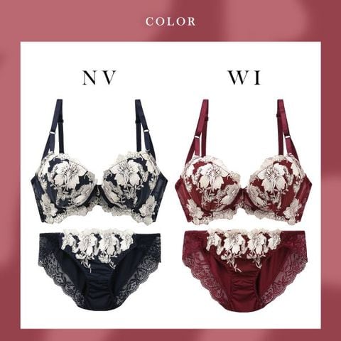 たっぷり盛り感のある刺繍で描いた艶やかな花々が、ディープカラーのカップに浮かび上がる華やかで洗練されたデザイン。