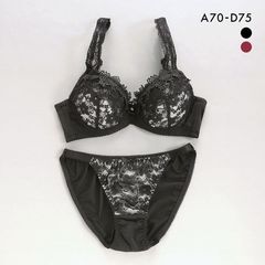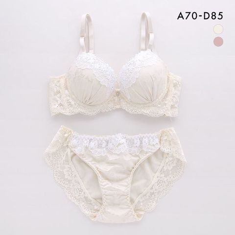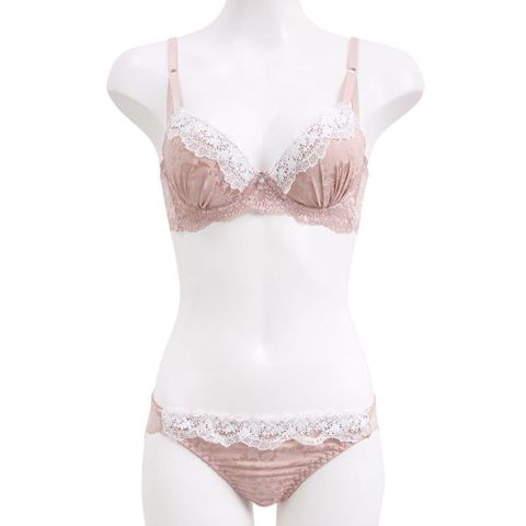 なめらかシルキーなフラワージャガードサテンにオーロラ糸のきらめくケミカルレースを重ねた清楚で上品なブラセット。