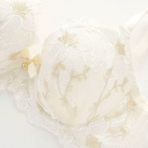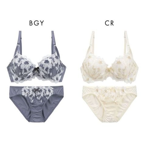 たっぷりの盛り感のある刺繍で美しく仕上げた、しとやかで洗練されたブラセット。光沢のある花びらがカップに浮かび上がる華やかなデザインです。