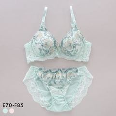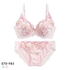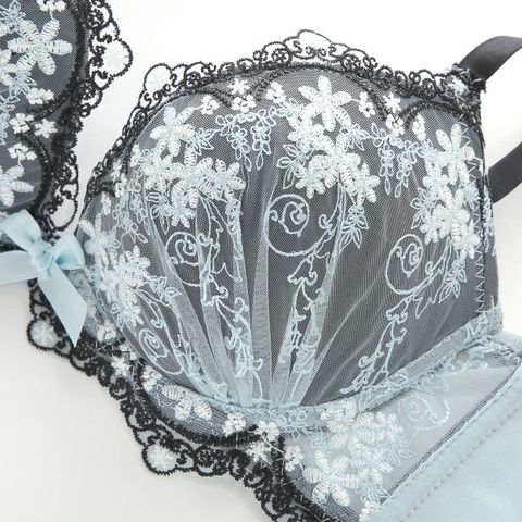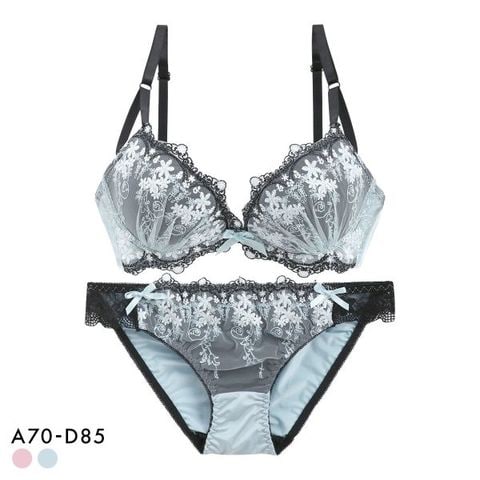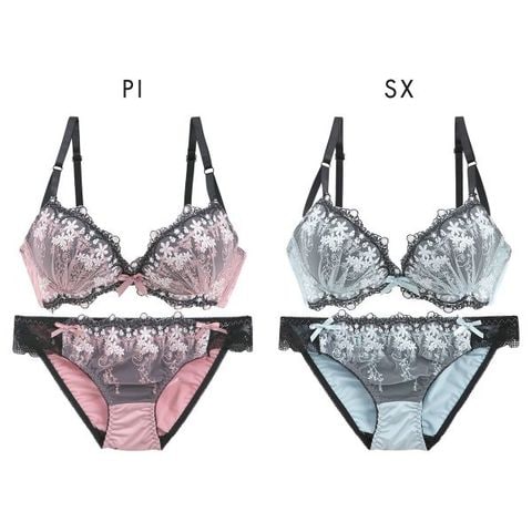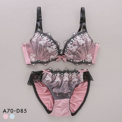オーロラ糸が輝くパステルカラーのフラワー刺繍にブラックを組み合わせた、ダークかわいいブラセット。