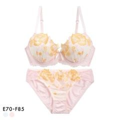 ブラは丸みのきれいなもっちり下厚の内蔵モールドカップ仕様。バストを中心に集めてキープしやすいL字ワイヤーがバストボリュームをほどよく寄せて、ナチュラルなバストラインをメイクします。