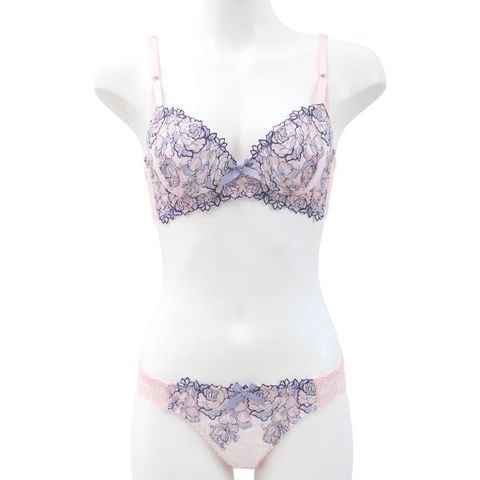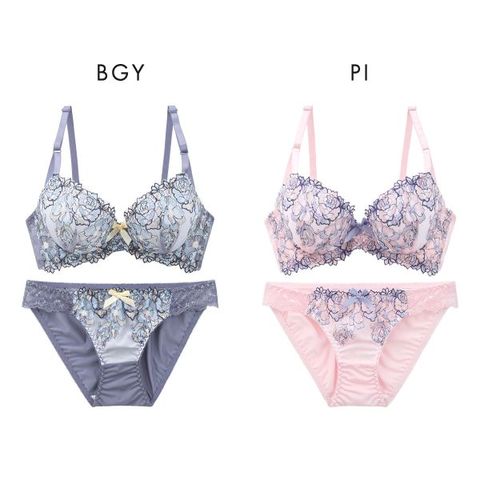 きらめくラメと光沢が美しいローズ刺繍がカップを埋めつくす、繊細で華やかなブラセット。胸中心には刺繍糸と色を合わせた大きなリボンをあしらい愛らしさをプラス。