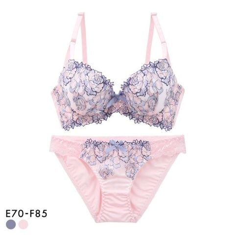 きらめくラメと光沢が美しいローズ刺繍がカップを埋めつくす、繊細で華やかなブラセット。胸中心には刺繍糸と色を合わせた大きなリボンをあしらい愛らしさをプラス。