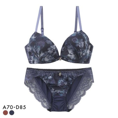 フラワージャガードのマットなシフォンにフォギーなフラワープリントをのせた、モードで大人なブラセット。胸中心のジュエルチャームが華やかなエッセンスをプラス。