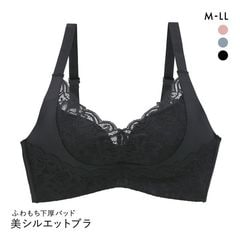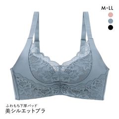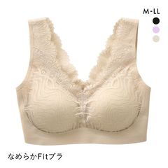 やわらかなストレッチレースをデコルテを飾るようにあしらった華やかなデザインのノンワイヤーブラ。するんとなめらかで、伸縮性に優れたほどよいパワー感のある生地が、身体にフィットしバストを支えます。