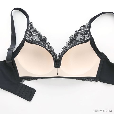 カップから土台にかけて一体型の薄くて軽いモールドカップを使用。ノンワイヤーでも全体に胸をホールドして、谷間を作ります。