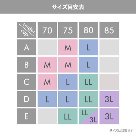 | 仕 様 | ・脇高設計 ・ノンワイヤー ・3/4カップ ・ホックの数:3段4列 ・左右一体型のモールドカップ ・パッドなし、パッドポケットなし ・肩紐取外し:不可 ・肩紐調節:可能 ・サイドボーン:あり ・Uバック |