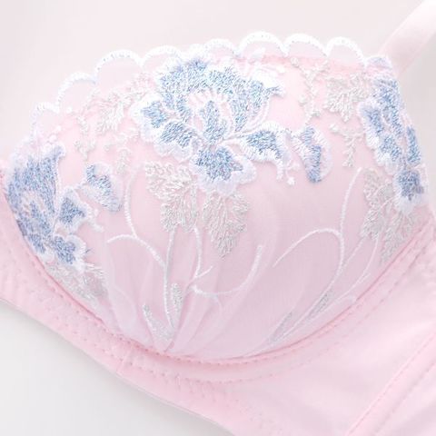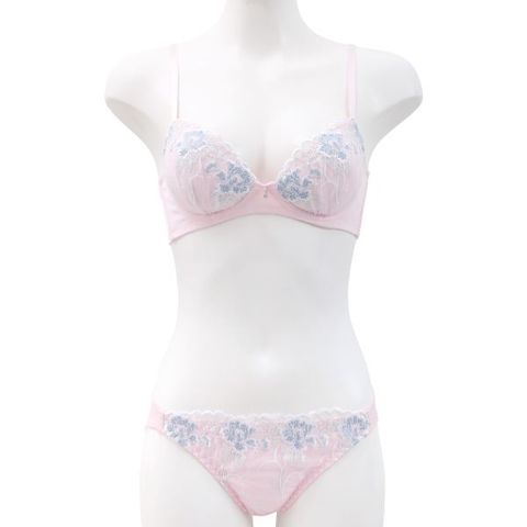 ほのかにラメが煌めくフラワー刺繍がフェミニンなノンワイヤーブラセット。なみなみのスカラップが可愛らしさを添えています。