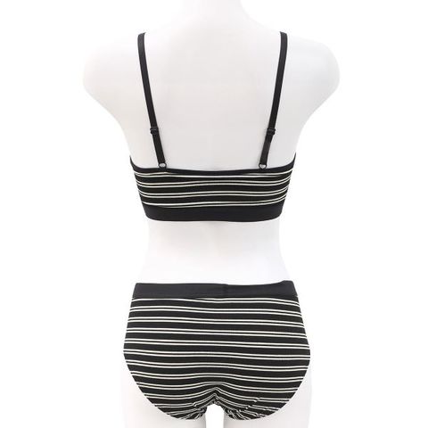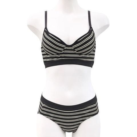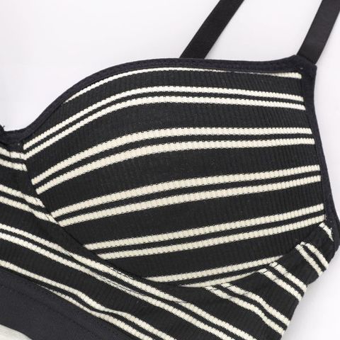 細幅のリブボーダーにブラックの幅広アウトゴムを組みわせた、カジュアル&スポーティなノンワイヤーブラセット。ストレッチのきいた生地を全体に使用しているので、着心地抜群でしめつけ感が少なくストレスを軽減してくれます。