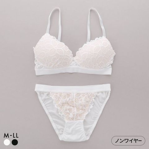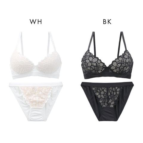 | 仕 様 | ブラ ・ノンワイヤー ・2段3列ホック ・3/4カップ ・やや下厚内蔵パッド、パッドポケットなし ・肩紐取外し:不可 ・サイドボーン:なし ショーツ ・伸縮性:フロントは横に、バックは縦横にあり ・透感:なし(ホワイトは若干あり) ・クロッチ:付き |