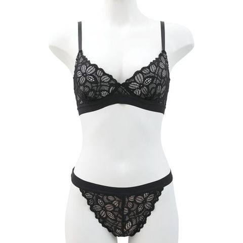 ざっくり編まれた花柄のレースをあしらったブラレットとショーツのセット。すっきり清潔感のあるシンプルなデザインです。