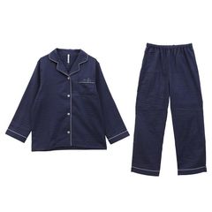 衿の形状とシャツ&パンツのデザイン、シルエットをエレガントにし、すっきりとした配色のパイピングを施し大人上品なパジャマに仕上げました。ボタンは高級感のある貝調4つ穴でシックにまとめました。