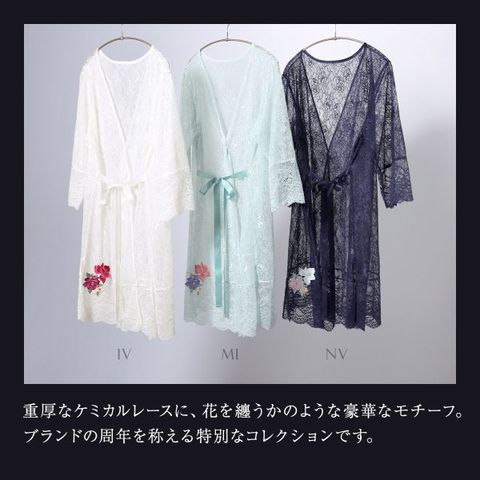 総レース仕立てのラグジュアリーなガウンは、透け感のある軽やかな素材がエレガントなムードを演出。裾の幻想的な刺繍モチーフが特別な輝きを添え、共布のサテンリボンで美しいシルエットに調整可能。羽織るだけで、至福のひとときと最高の贅沢感に包まれます。