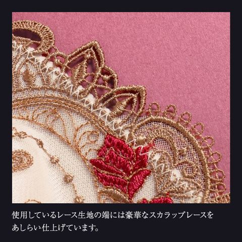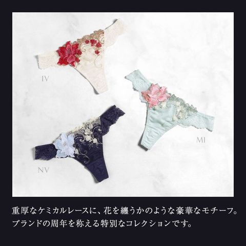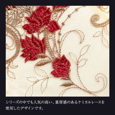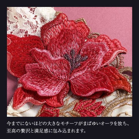 デザインには、まるで身体を花々で包み込むような重厚で存在感のあるケミカルレースと今までにないほどの大きなモチーフが、まばゆいオーラを放ち、身につけると至高の贅沢と満足感に包み込まれます。