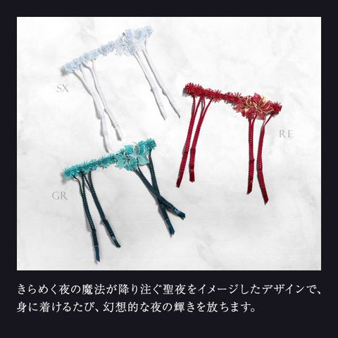 ポインセチアと雪の結晶のオーナメントモチーフがベルト状にパターンリピートされたきらびやかなデザインのガーターベルト。ウエストはアジャスター仕様でお好みのフィット感に調節可能。留め具はボストンタイプでストッキングの着脱もなめらかです