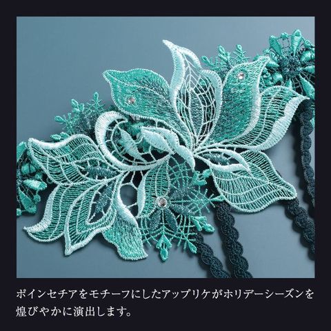 ポインセチアの情熱的な赤と、きらめくゴールドの刺繍が織りなす華やかなカラー。特別な夜にふさわしい、エレガントでロマンティックな魅力を纏えます。