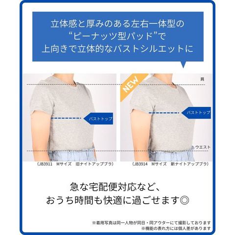 睡眠時に重力でひっぱられるバストを包みこむようにささえ、適正な位置に安定してくれるナイトアップブラ。