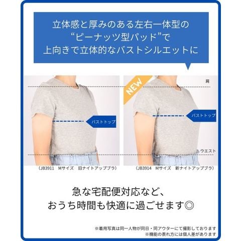 睡眠時に重力でひっぱられるバストを包みこむようにささえ、適正な位置に安定してくれるナイトアップブラ。