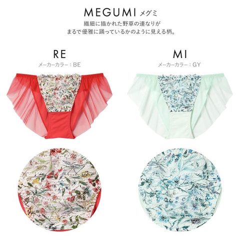 ・BE,GYカラーは「MEGUMI」柄、BU,LBカラーは「JESSIE'S JEWEL」柄をレースにプリント。