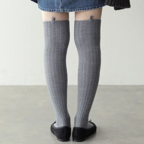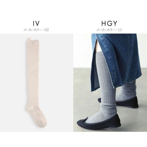 はき口のタブ付きデザインがポイント。しっかりとした肉厚感のある太リブで、ゆるっとルーズに履くのがおすすめ。伸ばして履くとひざ上丈になります。