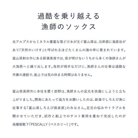 過酷を乗り越える漁師のソックスとして、試作と船上でのテスト着用を重ねて完成したのが高機能靴下「PESCALLY」です。