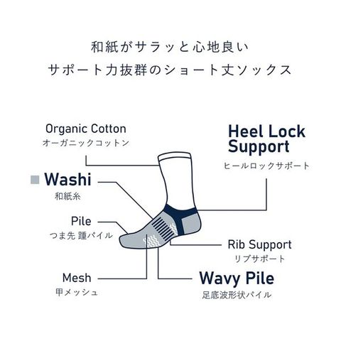 和紙がサラッと心地良いサポート力抜群のショート丈ソックス。ムレが気になるつま先からくるぶしにかけては吸水速乾性のある和紙を使用。つま先や踵、足裏にゴムサポートが入っているのでしっかりとホールドしてくれます。甲メッシュや足底波形状パイルで通気性も良く、足元のムレに効果的です。