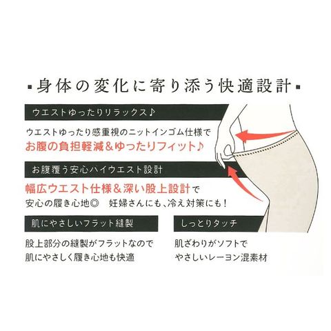 ウエストはゆったり感重視のニットインゴム仕様でおなかの負担軽減&ゆったりフィット。おなかを覆うハイウエスト設計で、妊婦さんはもちろん、冷え対策にも。しっとりなめらかなレーヨン混素材を使用し、ソフトな肌ざわりです。