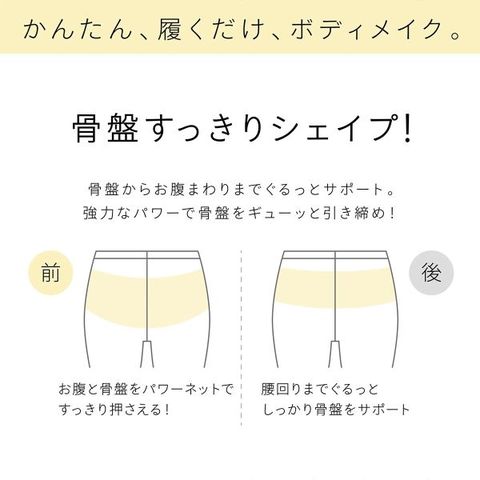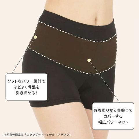 パワーネットがお腹と骨盤をギューッと押さえ、腰回りまでぐるっとしっかりサポートしすっきりと骨盤を引き締めることができます。身体にフィットする細身のシルエットながら、ストレッチが効いているので着心地も快適なのもうれしいポイント。