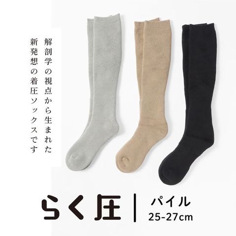 らく圧は、「筋肉へのアプローチ」「足首圧の軽減」という、従来品にはない新しい考え方2つを取り入れた、履きやすく、効果も期待できる、解剖学の視点から生まれた新発想の着圧ソックスです。