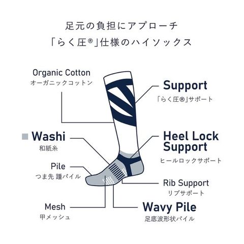 | 仕 様 | ・ハイソックス ・つま先/踵パイル ・ヒールロックサポート ・甲メッシュ ・足底波形状パイル ・レッグ部分オーガニックコットン使用 ・着圧値:足首部分/約10hPa以下、ふくらはぎ部分/約19hPa以上 |