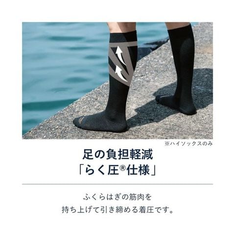 「らく圧」の編地構造で筋肉の収縮=筋ポンプ作用をサポート。ふくらはぎの筋肉を押し上げることで軽やかな足元をキープ。筋肉が少ない足首部分の圧を弱めた構造で脱ぎ履きしやすくなっています。仕事やアウトドアシーン、タウンユースなどいろいろな場面で活躍してくれます。