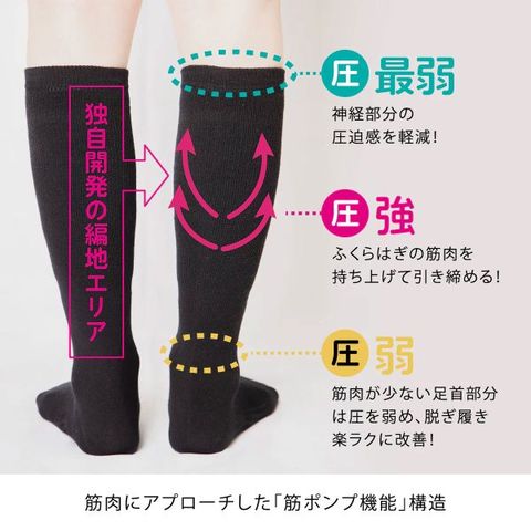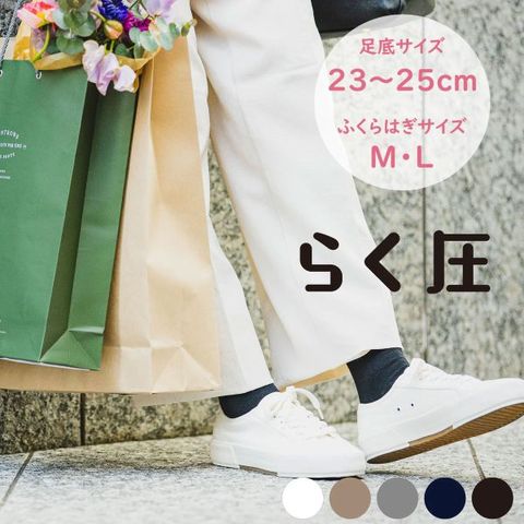 らく圧は、「筋肉へのアプローチ」「足首圧の軽減」という、従来品にはない新しい考え方2つを取り入れた、履きやすく、効果も期待できる、解剖学の視点から生まれた新発想の着圧ソックスです。コーディネートしやすいベーシックカラーで展開。
