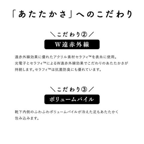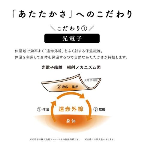 光電子は体温域で効率よく「遠赤外線」をふく射する保温繊維。体温を利用して身体を保温するので自然なあたたかさが持続します。また、ふわふわボリュームパイルが足をあたたかく包み込み、肉厚の生地が凍てついた床から足を守ってくれます。更にW遠赤外線のチカラであたたかさが持続します。