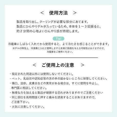 アルミヘッドの中にひんやりゲルを内蔵しているため、冷蔵庫に入れなくても冷たい感触が持続。マッサージ後に本体を1から3回振ると、約2分間の心地よいひんやり感が持続します。