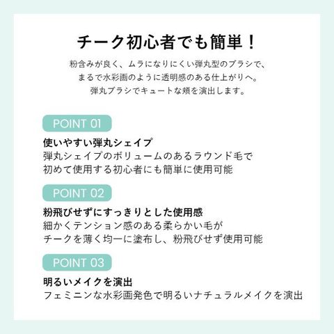 粉含みが良く、ムラになりにくい弾丸型のブラシで、まるで水彩画のように透明感のある仕上がりへ。チーク初心者でも簡単に、弾丸ブラシでキュートな頬を演出します。