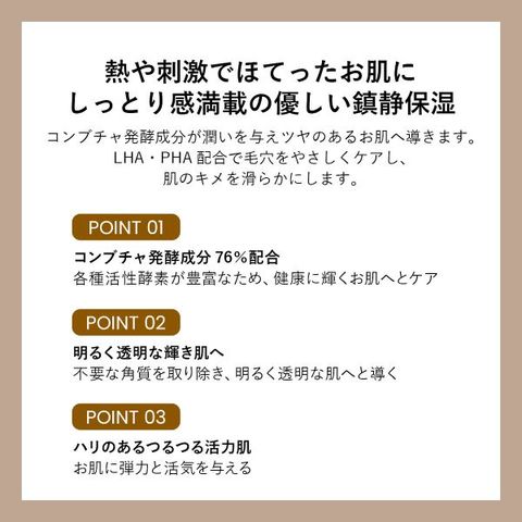 エッセンシャルな発酵コンブチャを76%も配合したしっとり感満載の優しい鎮静保湿でしっとりとうるおいに満ちた健康なお肌へ。