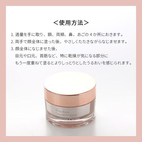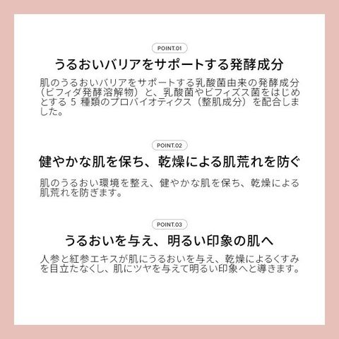 肌のうるおいバリアをサポートする乳酸菌由来の発酵成分(ビフィダ発酵溶解物)と、乳酸菌やビフィズス菌をはじめとする5種類のプロバイオティクス(整肌成分)を配合したクリームです。