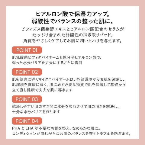 ・弱酸性ヴィーガンパッド:PHAとLHAが不要な角質を整え、なめらかな肌に。コンディションが崩れがちなお肌のバランスを整えトラブルを防ぎます。