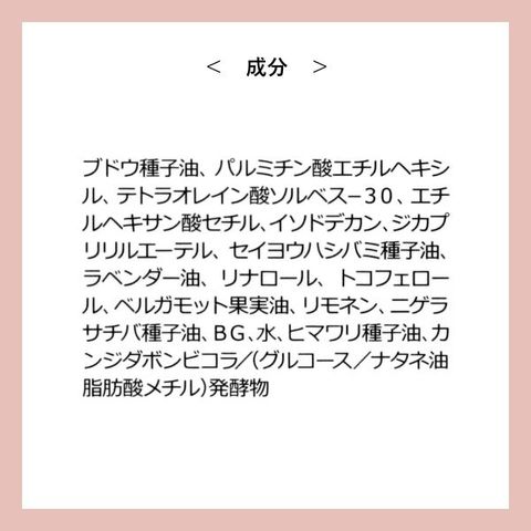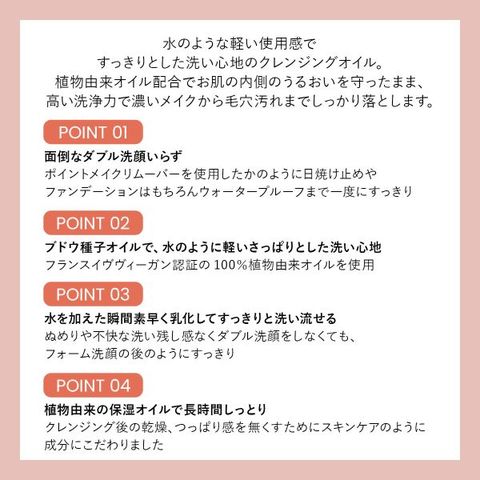 ・軽やかな使用感 スペイン産ブドウ種子油*配合。水のようにさらっとしたテクスチャーで、肌に負担をかけずにメイクを浮かせます。水を加えると素早く乳化し、ベタつきを残さず洗い流せます。