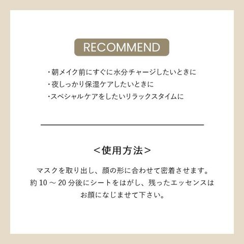 マスクを取り出し、顔の形に合わせて密着させます。約10~20分後にシートをはがし、残ったエッセンスはお顔になじませて下さい。