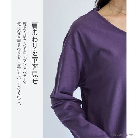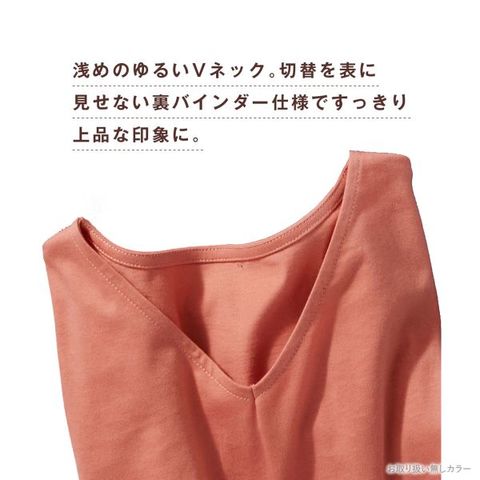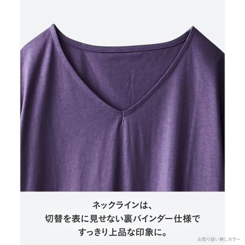 汗染みのお悩みに寄り添う、綿100%のVネック長袖Tシャツです。きつく開きすぎないゆるやかなVネックが、優しい印象を与え、カジュアルすぎず大人っぽく着こなせます。