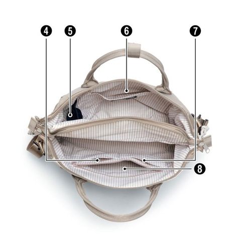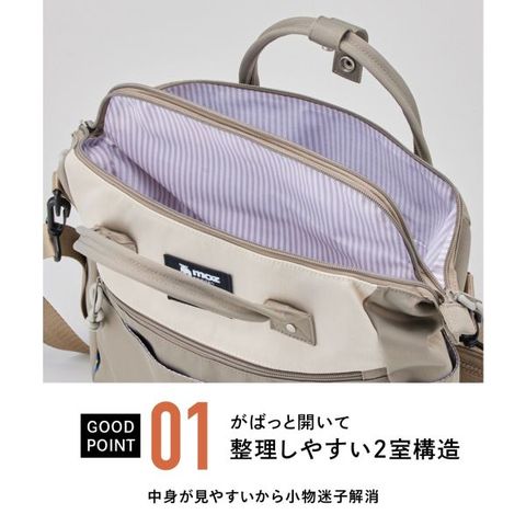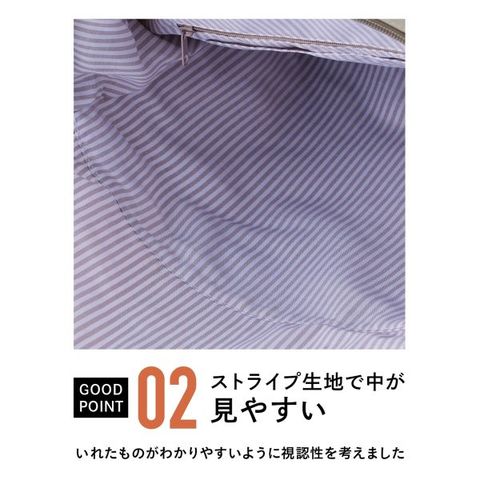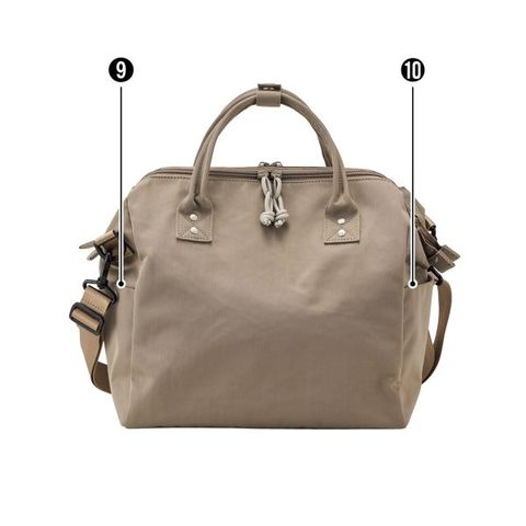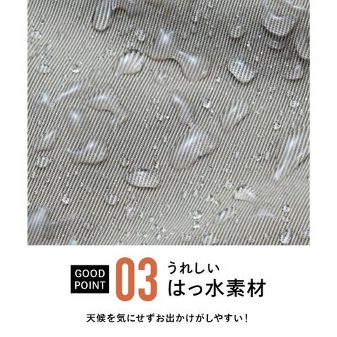 2層構造と合計10個のポケットで、荷物の仕分けが簡単。見た目以上のたっぷり容量で、旅行や行楽にも最適です。はっ水生地なので、天候を気にせずお出かけを楽しめます。