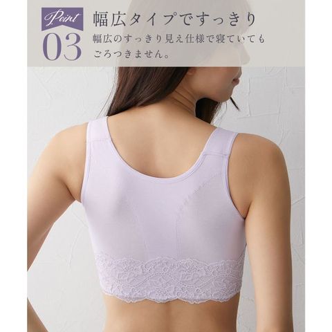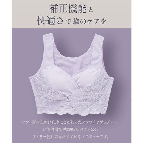 就寝時におすすめの、ニッセンオリジナル「n Dream」シリーズのナイトブラ。ワイヤーやサイドボーンなしでも、クロスアップカシュクールパネルがバストを優しく寄せ上げ、寝返りを打っても流れを防止します。
