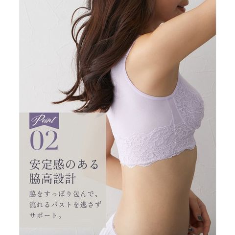 幅広ストラップが肩への食い込みを防ぎ、脇高設計で脇のお肉まですっきり整えます。肌に優しい綿混素材で、デリケートな肌にも安心。ノンワイヤーでも安定感を求める方におすすめです。