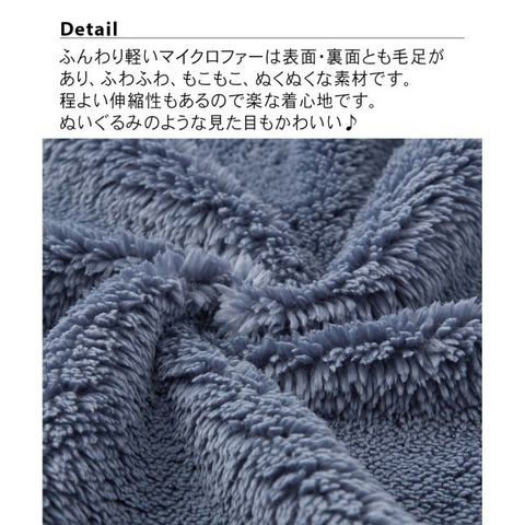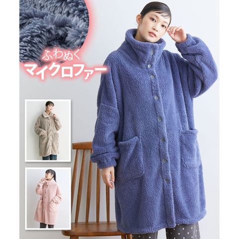 肌寒い季節に重宝する、マイクロファー素材のルームガウンです。ふわふわ、もこもこの長い毛足が空気を含んで暖かさを保ち、軽やかな着心地。
