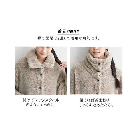 ボタンの開閉で襟元が2WAYになり、首元までしっかり暖めたり、すっきりとした襟にしたりとスタイルを選べます。長めの着丈で腰やお尻まですっぽり隠し、冷えから守ります。