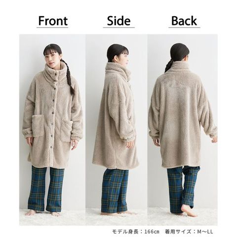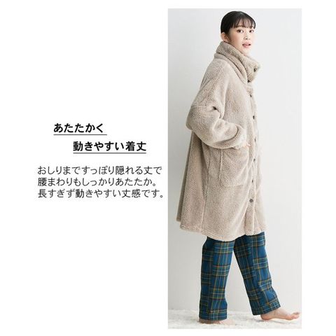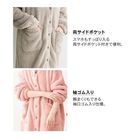 ゆったりサイズなので、冬のパジャマの上からも楽に羽織れます。袖口はゴム仕様で家事がしやすく、両サイドのポケットも便利。肌触りの良さと機能性を兼ね備えた一着です。