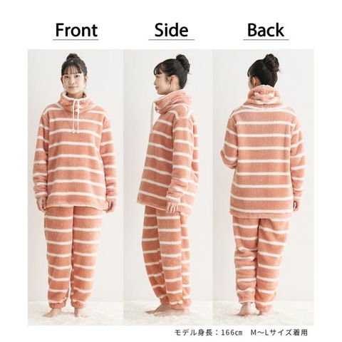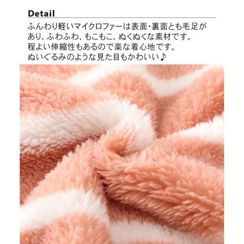 両面ボアのやわらかな肌触りが空気を含み、ボリュームがあるのにふんわり軽い着心地。程よい伸縮性があり、リラックスタイムにぴったりです。