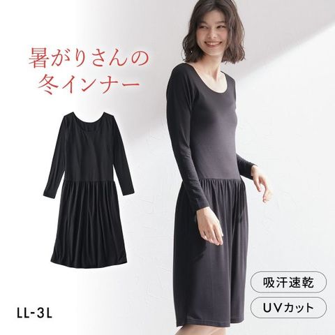ニッセン 暑がりさんの冬インナー 襟ぐり広め丈長め長袖スリップ LL 3L 吸湿発熱 吸汗速乾 UVカット 静電防止 ウォームコアAIR